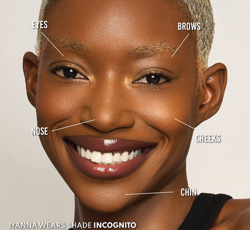 • Swirl across lowlighter, swipe onto cheekbones, brow bone, across the bridge of the nose and onto lips and then tap to blend & blur