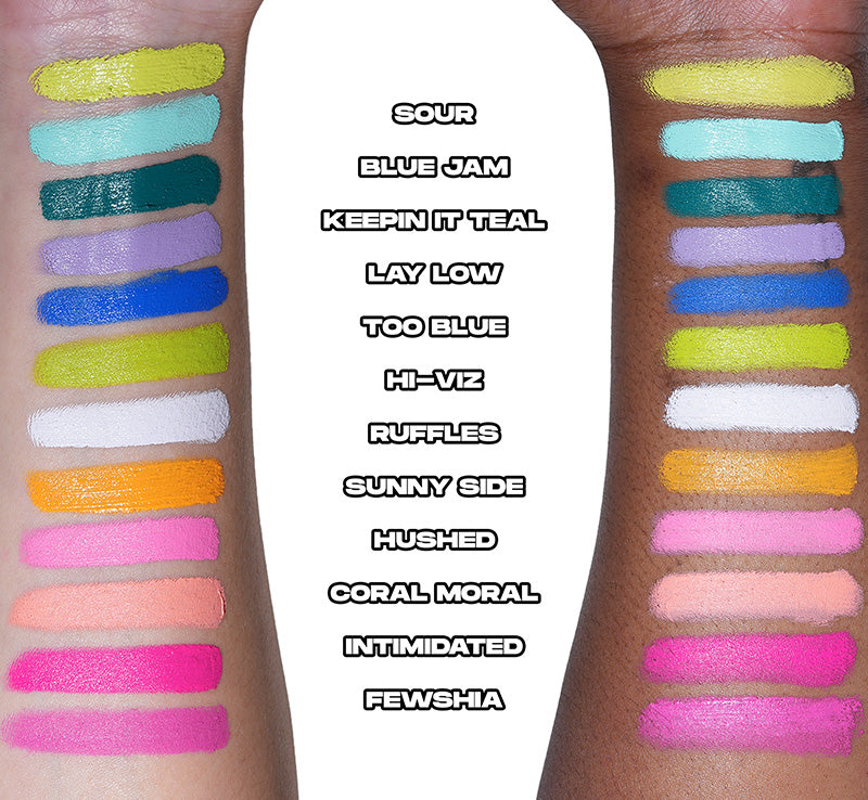 • Sour - lime green• Blue Jam - electric cobalt• Lay Low - soft purple • Too Blue - sky blue • Hi-Viz - neon yellow green• Ruffles - pale lavender • Sunny Side - bright yellow orange • Hushed - bubblegum pink • Coral Oral - electric salmon coral • Intimidated - a rose pink • Fewshia - a true hot fuschia